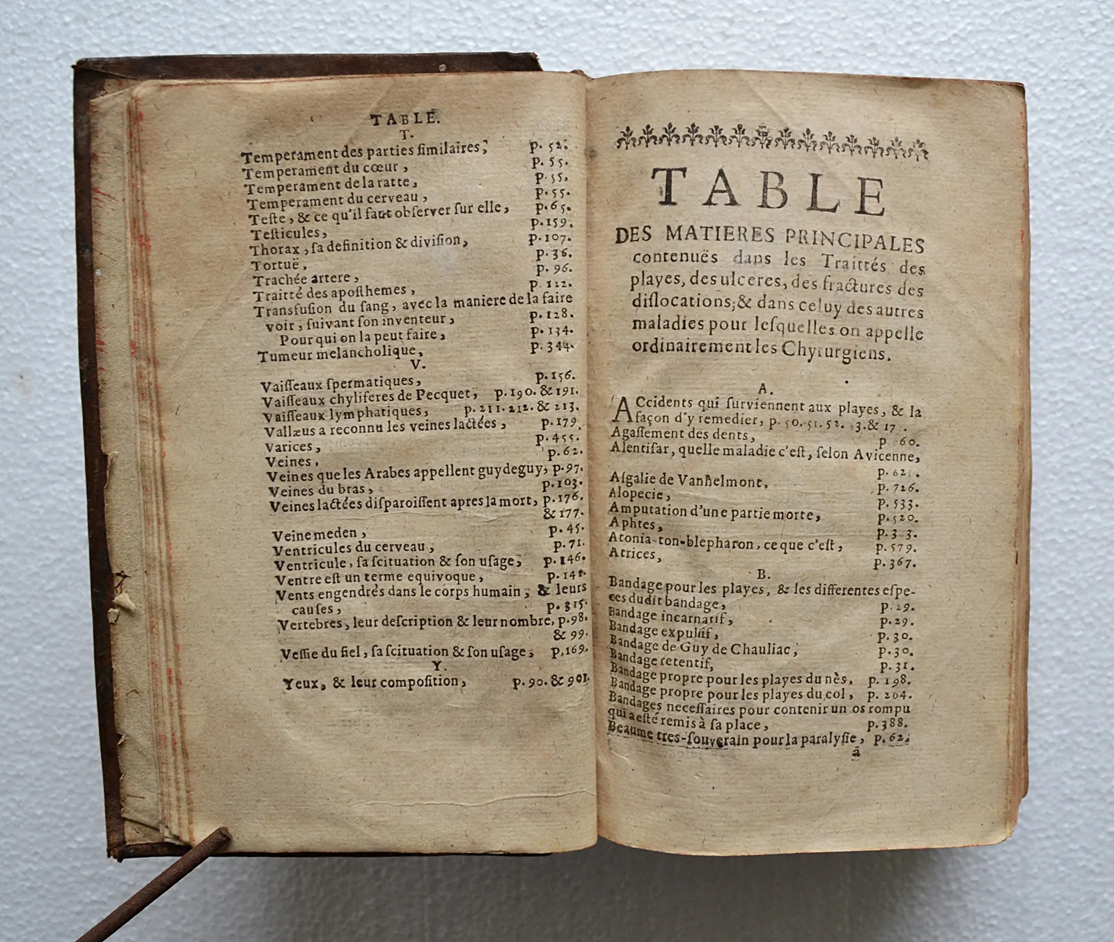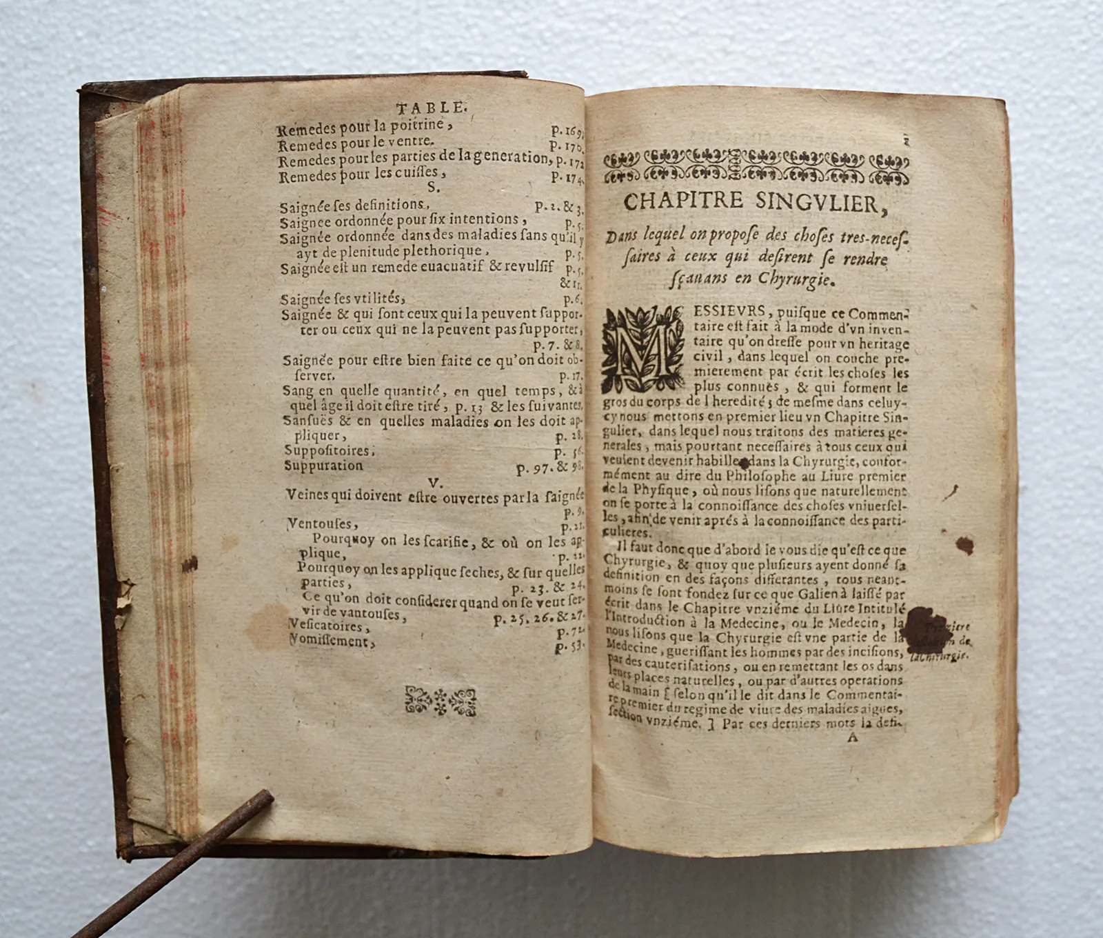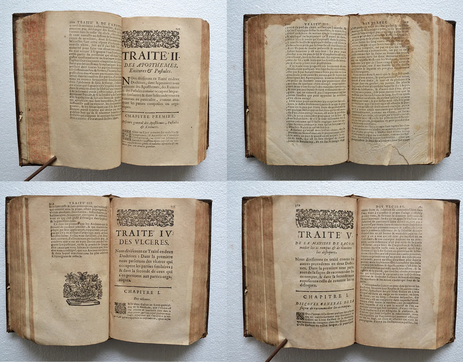 Quelques accrocs, notamment sur les coiffes ; épidermures ; ors ternis ; quelques taches et feuillets roussis, notamment sur trois feuillets (cf. photo) ; il manque deux feuillets dans le traité des plaies.