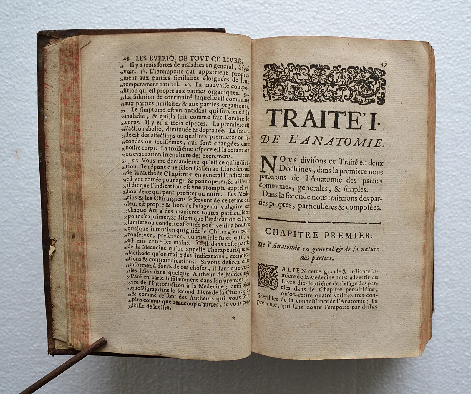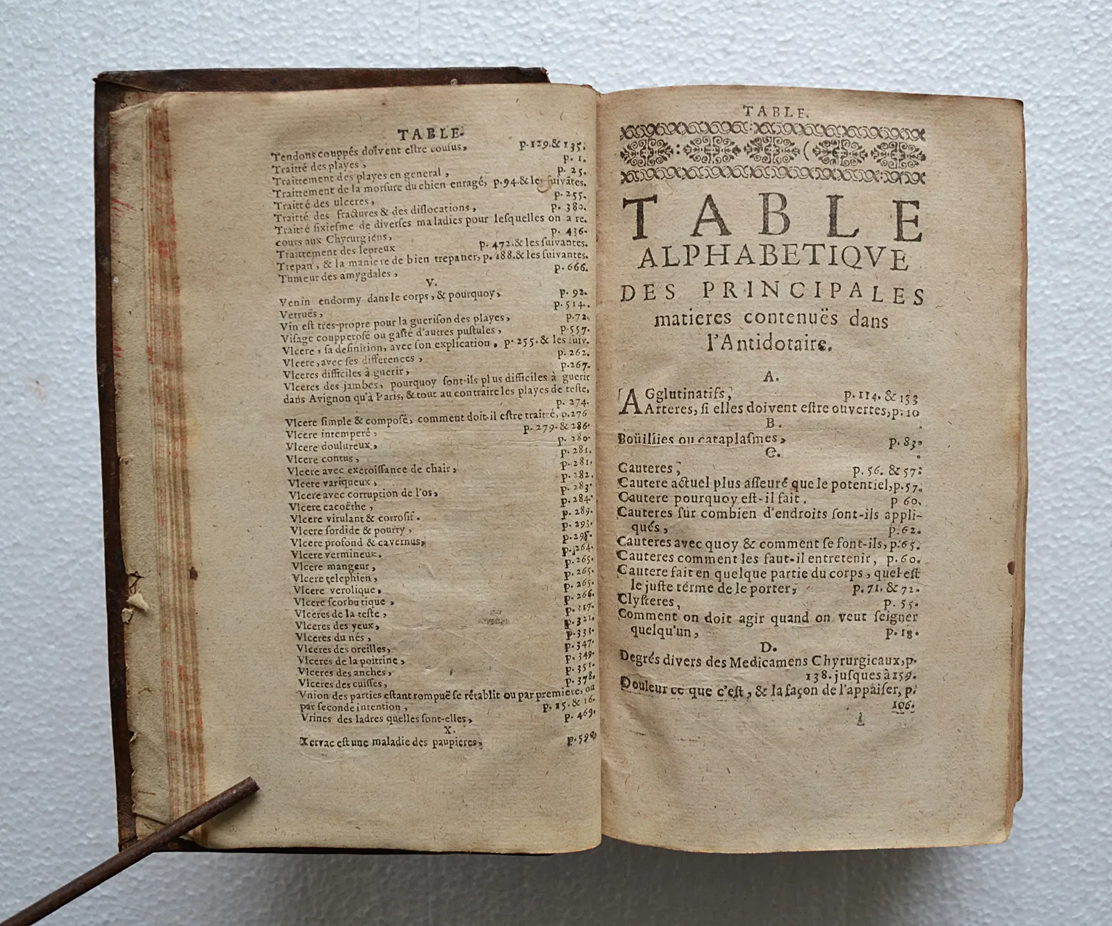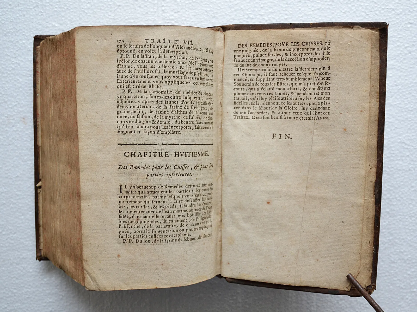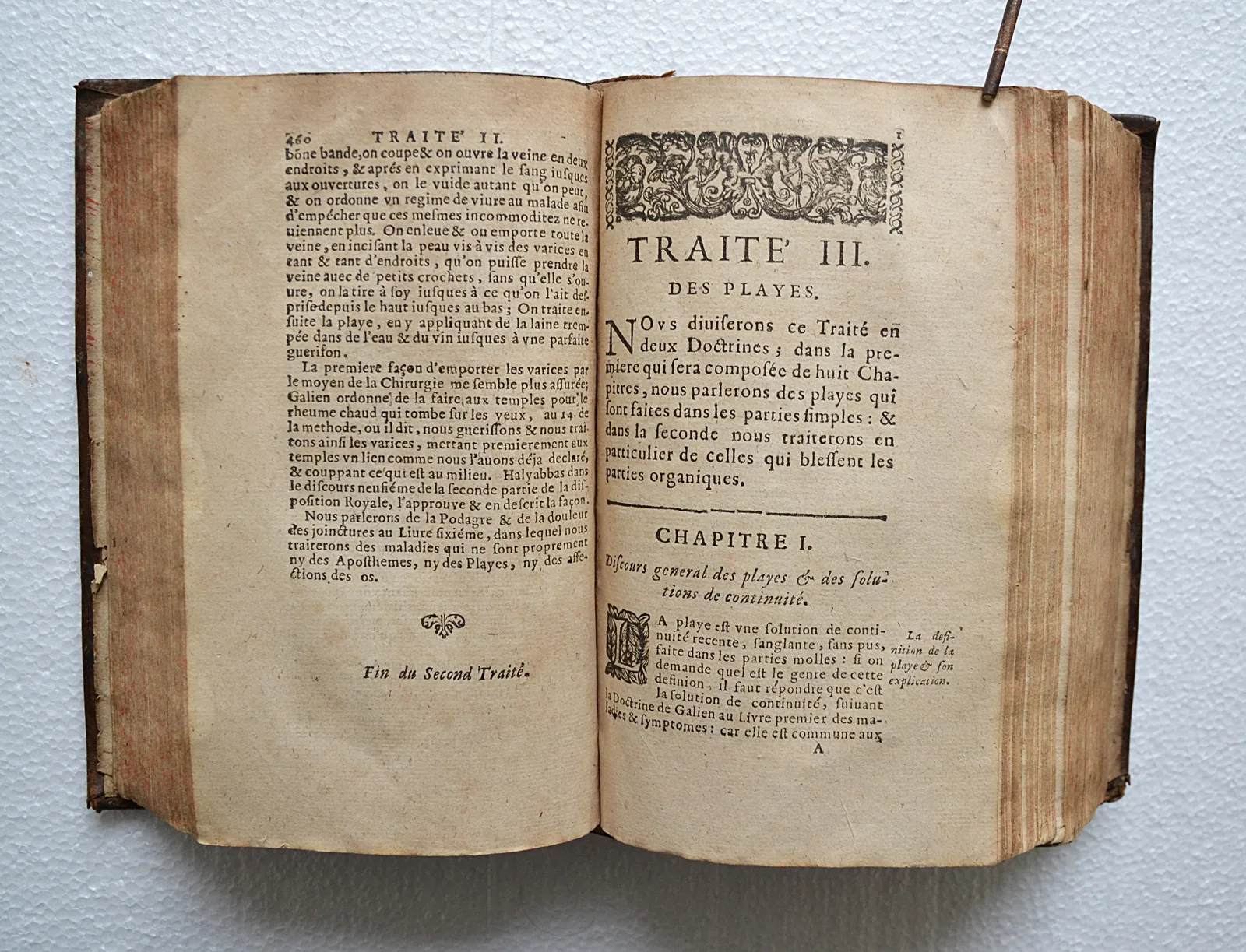 Quelques accrocs, notamment sur les coiffes ; épidermures ; ors ternis ; quelques taches et feuillets roussis, notamment sur trois feuillets (cf. photo) ; il manque deux feuillets dans le traité des plaies.