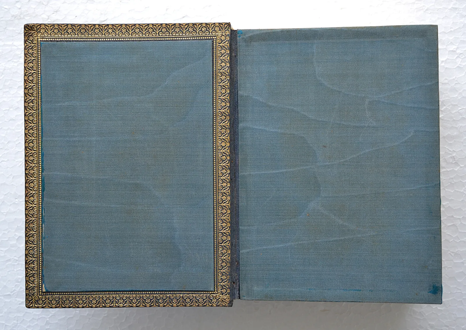 Tours, Alfred Mame et fils, 1891. Un volume in-12 (12 x 15,5 cm.) de 432 pages, maroquin bleu, large décor sur les plats dans un encadrement de filet doré, il est composé de trois roulettes dorées avec des motifs floraux, dos à nerfs orné d’un fleuron floral dans les entre-nerfs, filet doré sur les coupes, roulette dorée à l’intérieur, contregarde & garde en moire bleue, tranches dorées (dos éclairci).