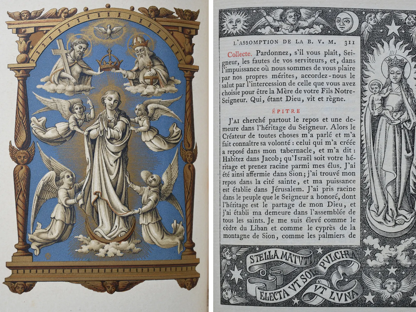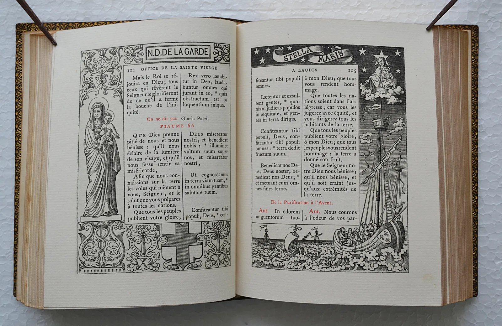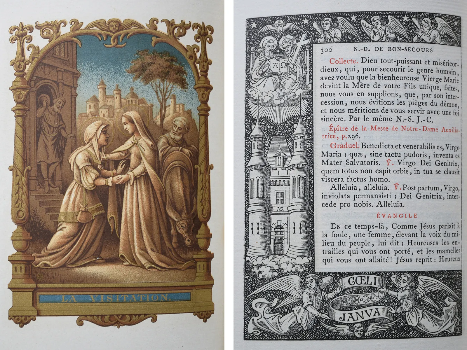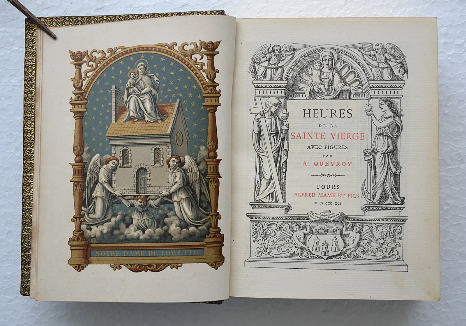 Bel exemplaire, illustré de 12 chromolithographies, avec le texte encadré de dessins en noir représentant la Sainte Vierge, des scènes religieuses et des décors divers.