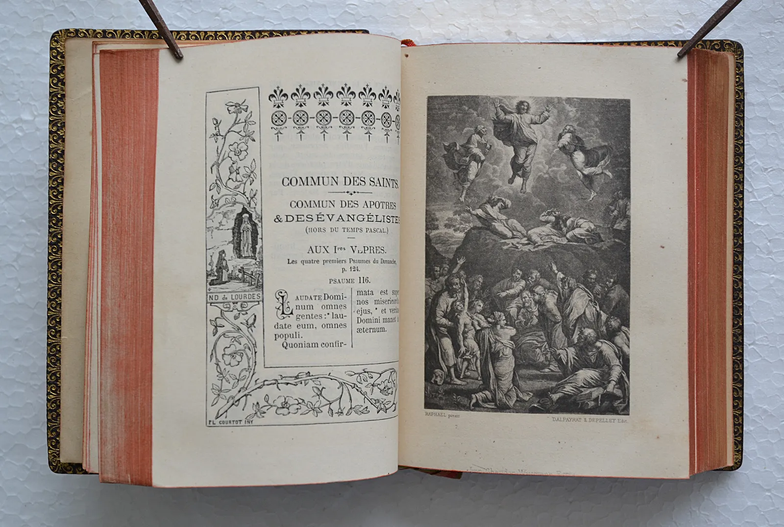 L’illustration se compose d’un frontispice et de trois dessins hors-texte, le texte est encadré de dessins floraux & religieux, dessinés par Courtot et gravés par E. Tilly.