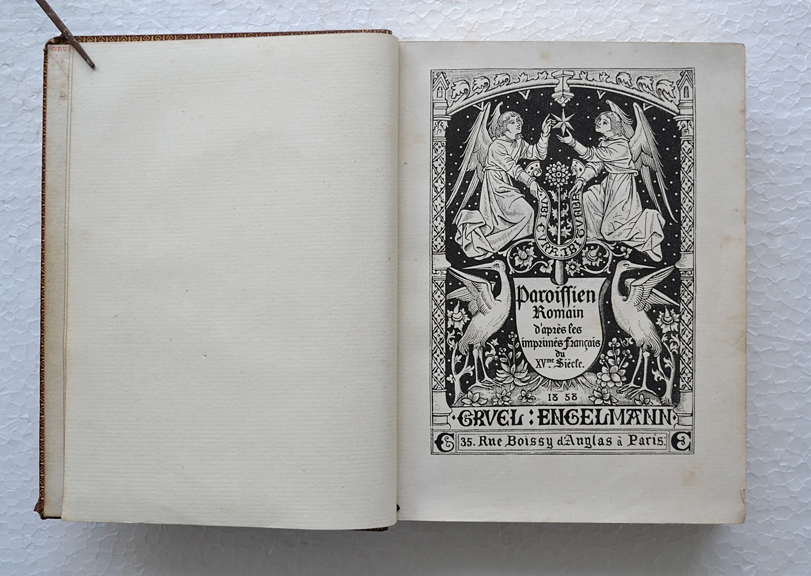 Paris, Gruel et Engelmann, 35 rue Boissy d’Anglas, 1858. Un volume in-12 (12,5 x 16 cm.) de 703(1) pages, maroquin rouge vermillon, croix stylisée en épines de ronces mosaïquée en maroquin noir avec les contours dorés, dos lisse, double filet doré sur les coupes, roulette dorée à l’intérieur, doublure & garde de moire rouge, tranches dorées (Gruel en lettres dorées en queue de dos & imprimé au verso de la première garde). Coins émoussés.
