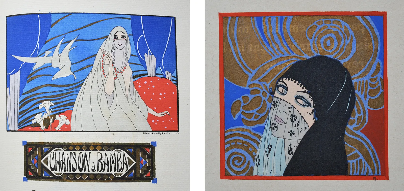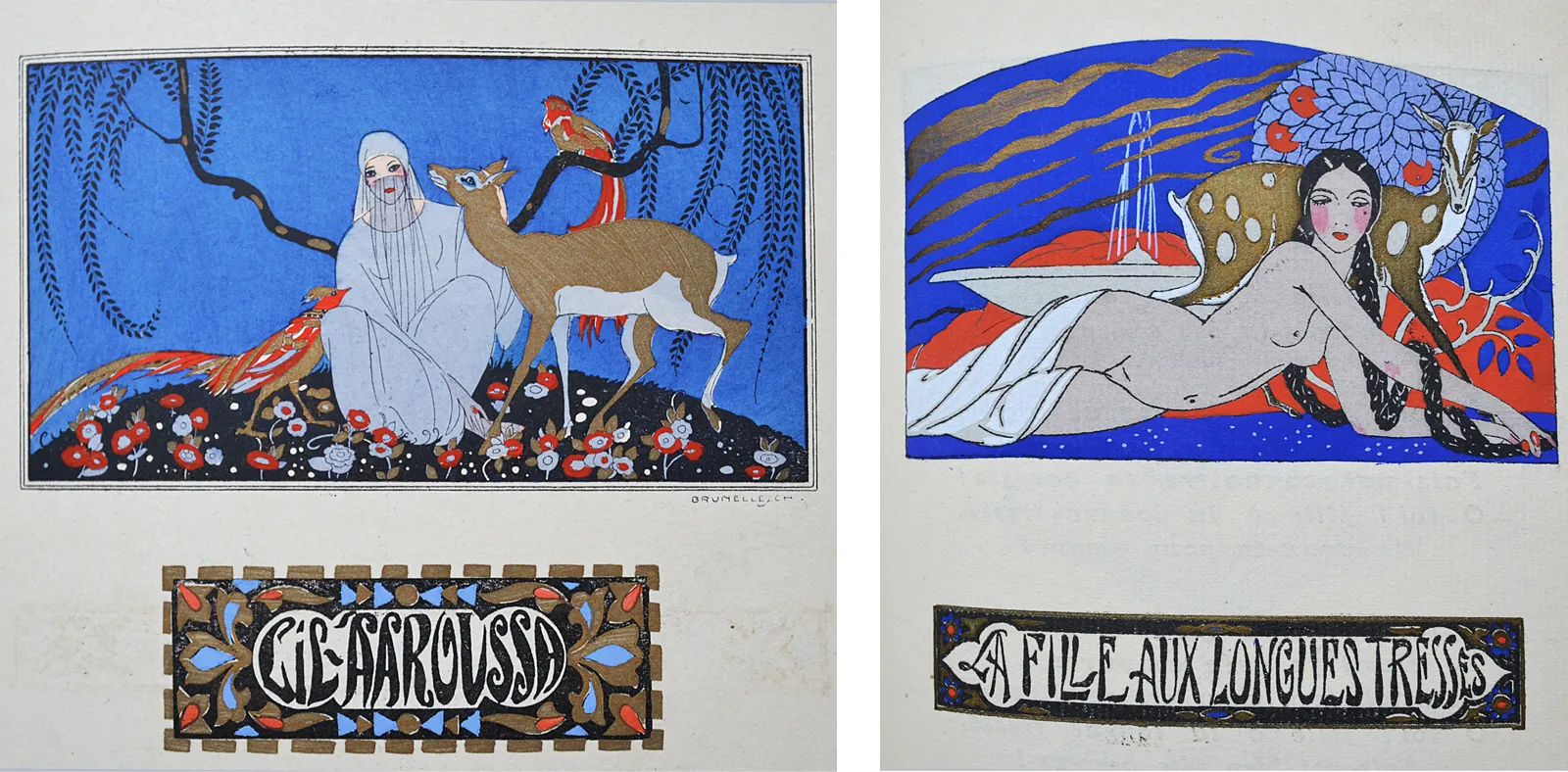 Rare et bel exemplaire, en maroquin de Kieffer, des 10 premiers numéros (sur 11) de cette magnifique et luxueuse publication Art-déco. Elle est illustrée de 10 couvertures par Brunelleschi, de 56 gravures hors-texte et de nombreux dessins et vignettes, le tout, colorié au pochoir par Jean Saudé.