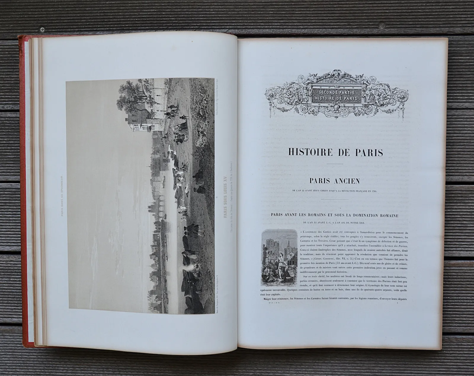 Bel exemplaire de cette somptueuse publication consacrée à Paris, que l’on doit à l’imprimeur et libraire Henri Charpentier. Elle est remarquablement illustrée par 38 vignettes gravées sur bois dans le texte et 100 grandes lithographies hors texte, tirées sur fond teinté et, pour certaines, rehaussées en couleurs.
