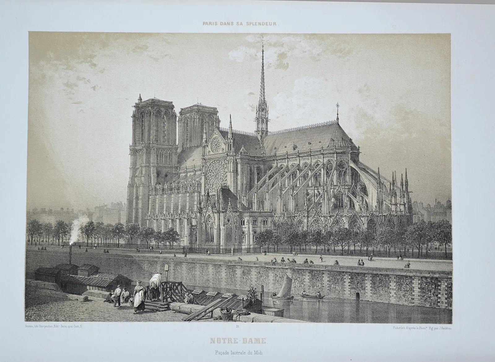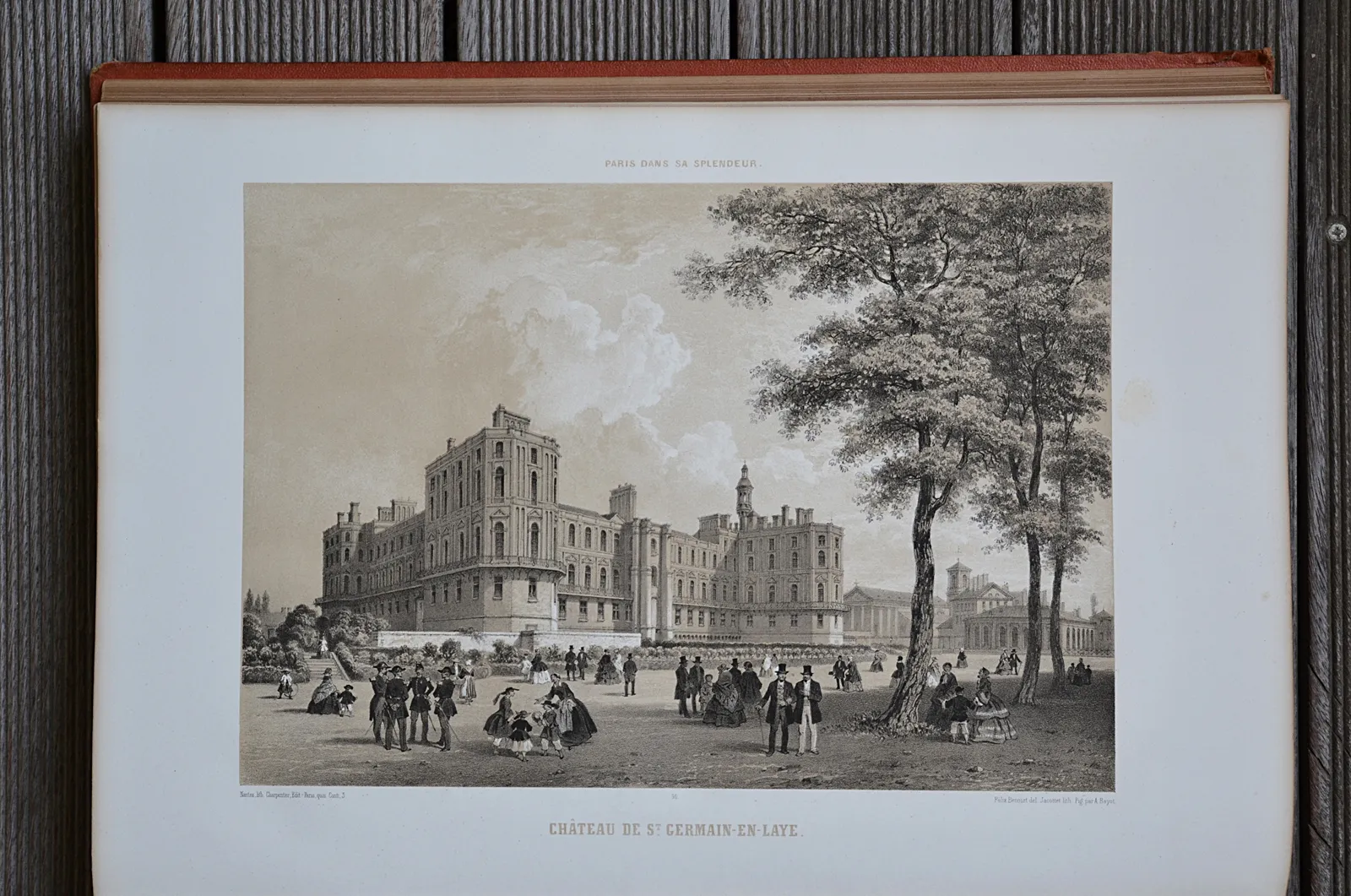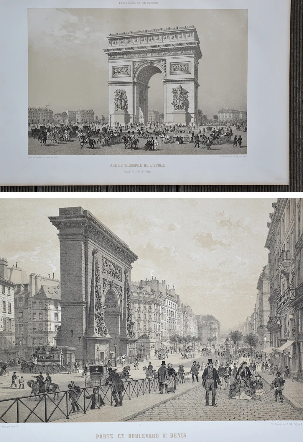 Lithographies par Philippe Benoist, Arnout, Bayot, Ciceri, Gaildreau, Fichot, Sabatier, etc., d’après les compositions de Ph. Benoist, Chapuy, Isabey, etc. Si l’apparition de la photographie s’avère fatale pour la lithographie de paysage, Paris dans sa splendeur s’inscrit dans une phase de transition : les grandes lithographies sont exécutées d’après des photographies, avec cette curiosité que sont les premières vues aériennes, sans doute prises d’un ballon.