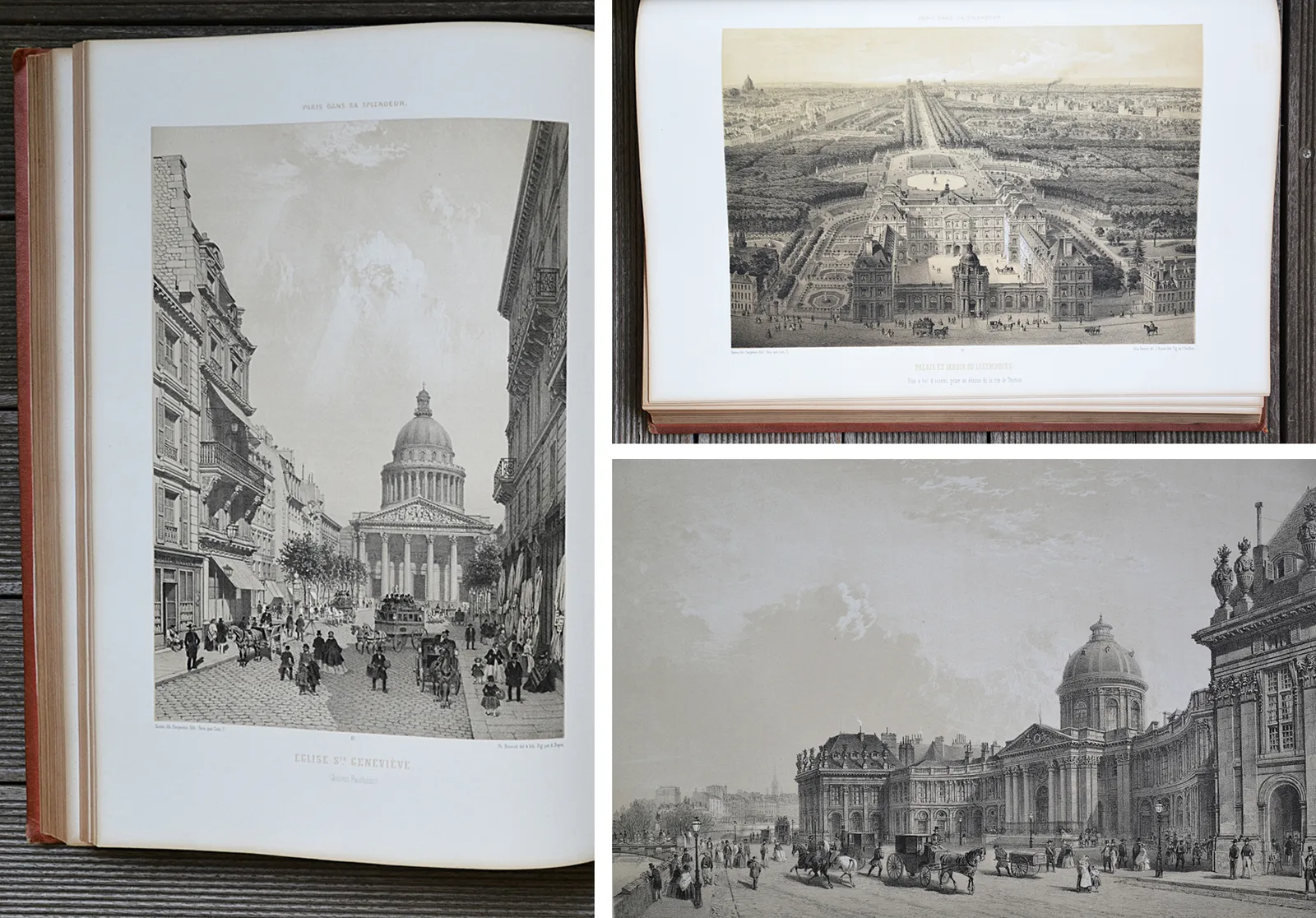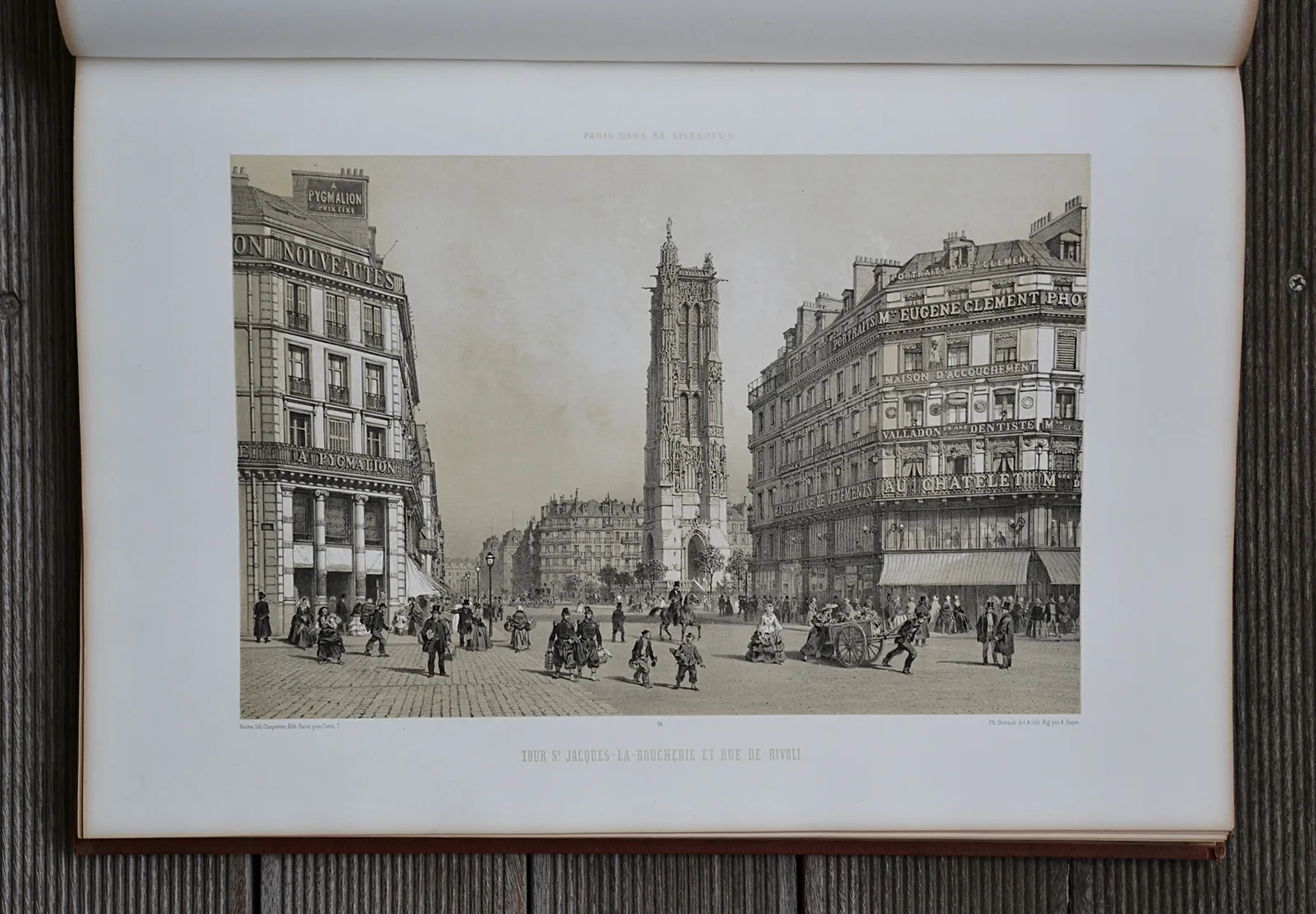 « Paris livré aux démolitions avec les travaux du baron Haussmann est en pleine mutation sous le second Empire et se transforme. Les trois volumes de Paris dans sa splendeur, nous offre un large panorama de la ville avec ses dernières constructions quand les pierres démolis sont remplacées par le fer et le verre des nouveaux bâtiments ». (Paris-Libris)