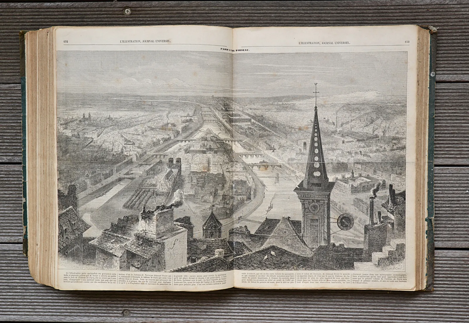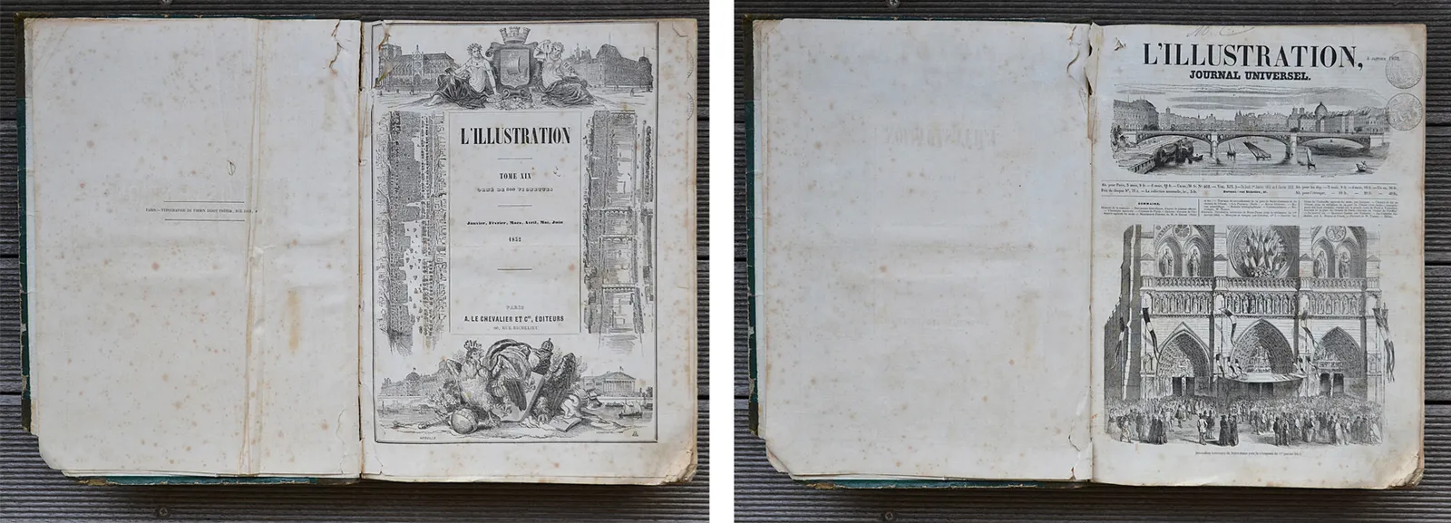 52 numéros reliés en un volume in-folio (27,3 x 37,5 cm.) de : (2ff.) – 440 pp. + (2ff.) – 423 pp. ; demi-percaline verte de l’époque, filets dorés sur les plats, dos à faux-nerfs orné.