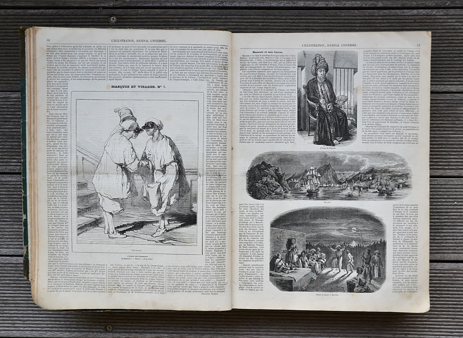 Très nombreuses gravures dans le texte : travestissements par Marcelin, petits métiers parisiens, faits de société, relations de voyages, etc. A noter 20 caricatures par Gavarni (Masques et visages).