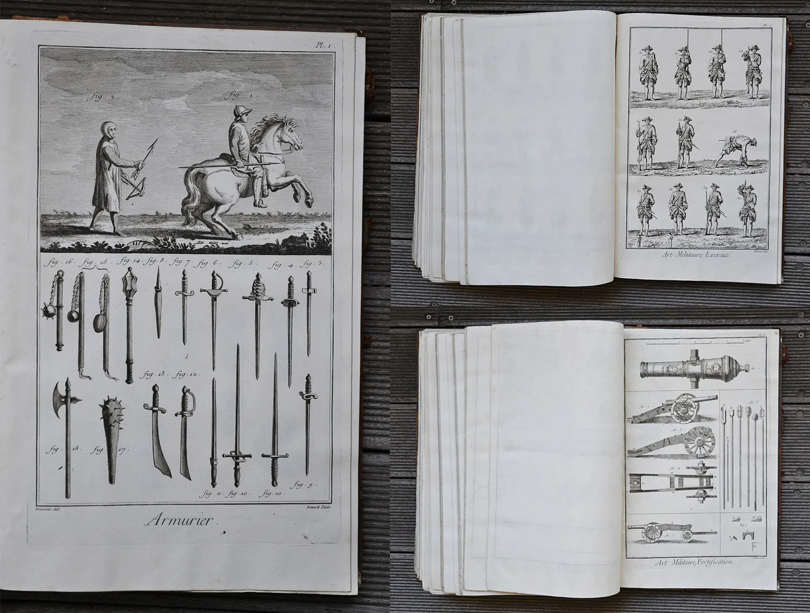 Thèmes : agriculture (83 pl.) ; anatomie (33 pl.) ; architecture (81 pl.) ; art militaire (38 pl.) ; artificier (7 pl.) ; armurier (2 pl.) ; arquebusier (7 pl.), etc.