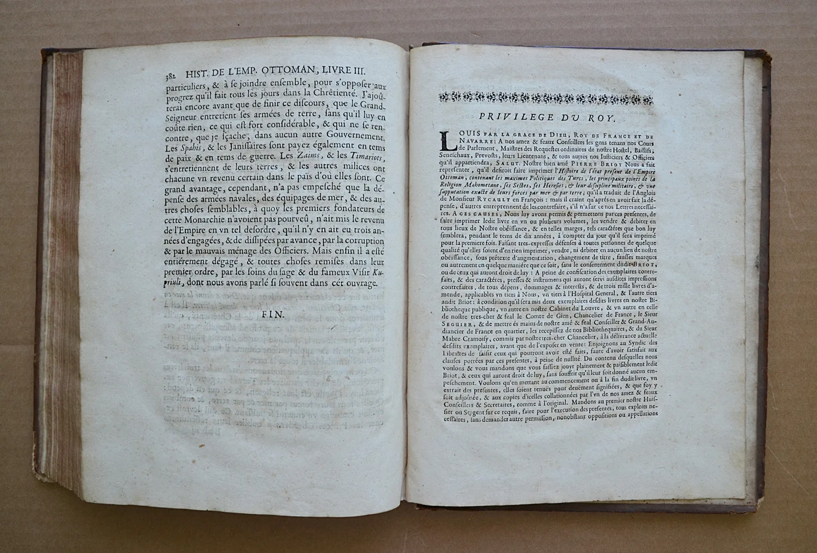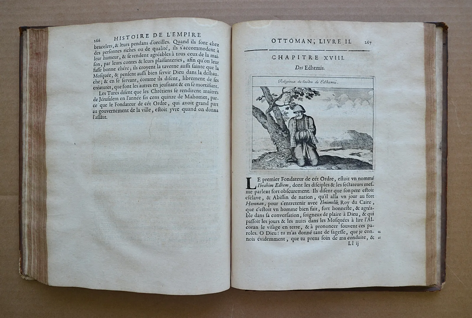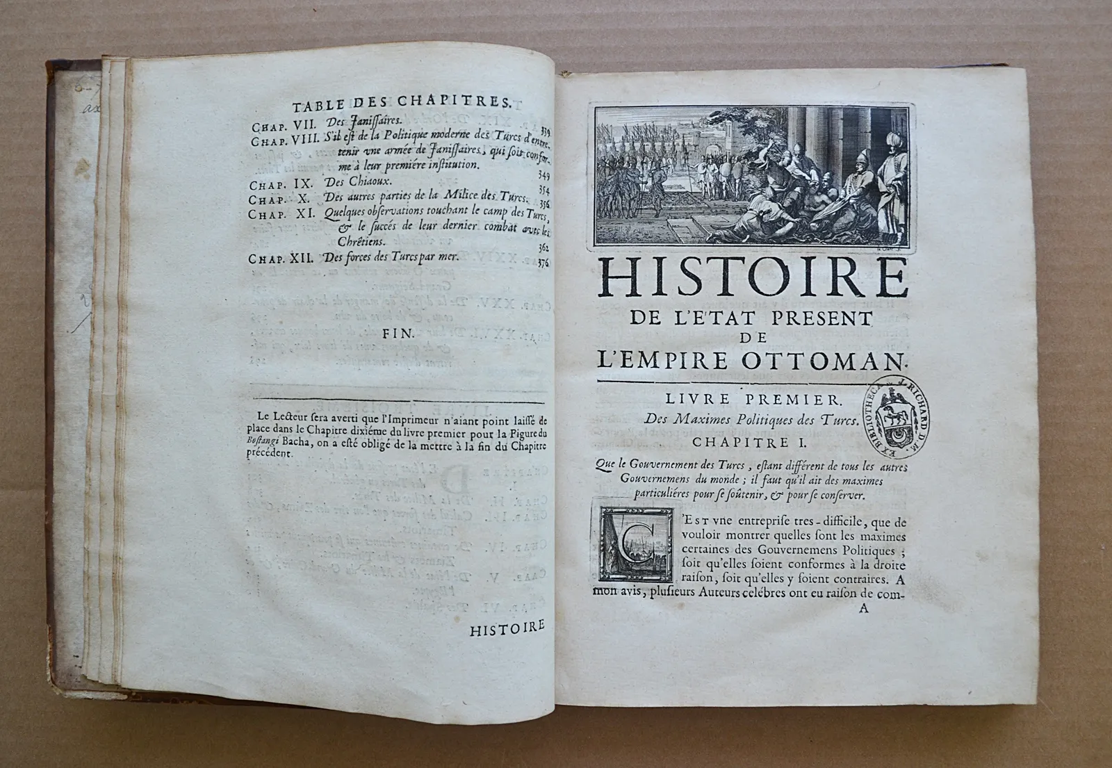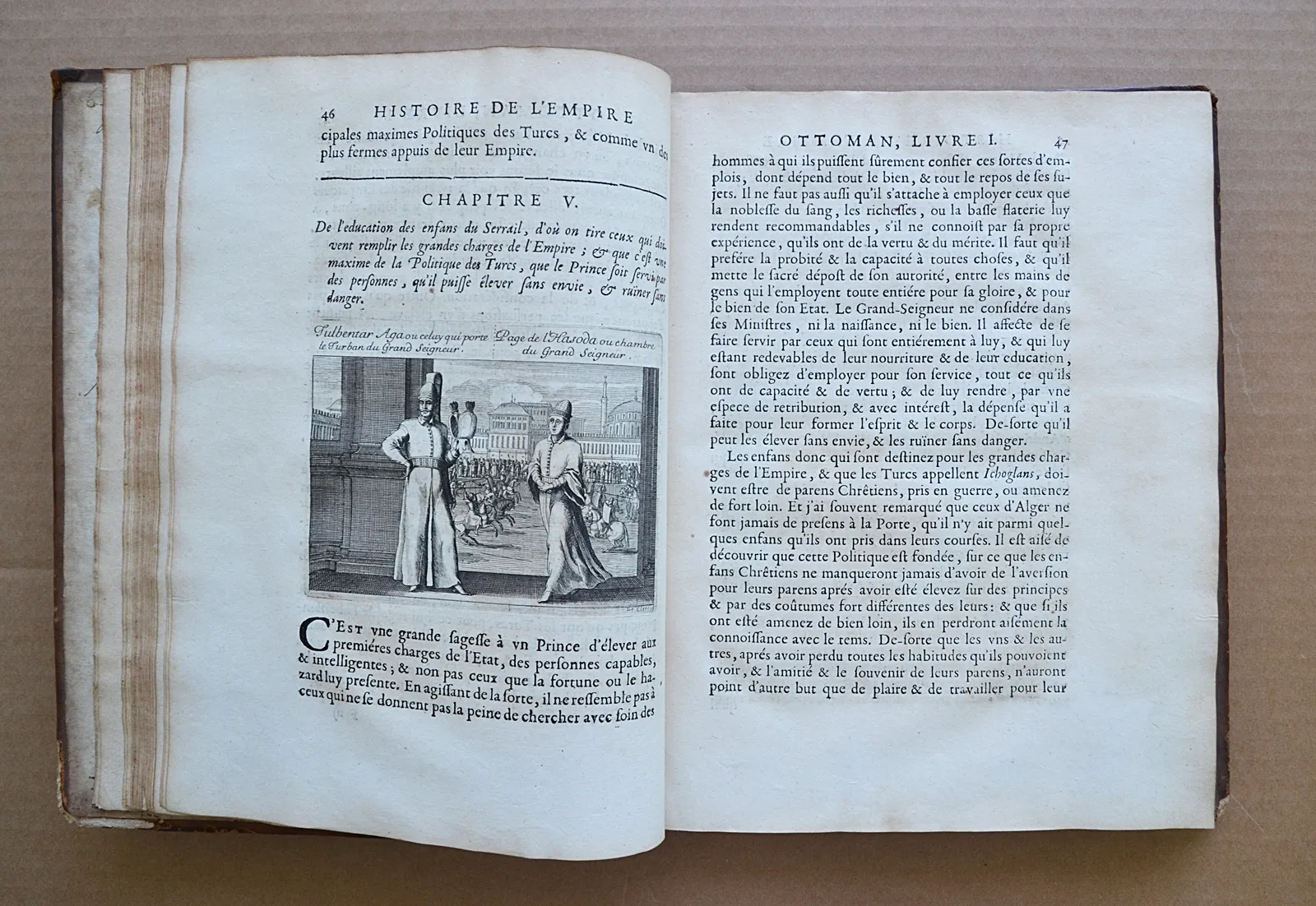 Première édition française, traduite par Briot. Elle est illustrée d’un beau frontispice, de 3 vignettes en-tête, de 3 lettrines historiées, et 21 vignettes dans le texte, le tout gravé en taille-douce par Sébastien Le Clerc. Les figures dans le texte représentent le sultan Mahomet Han, des dignitaires, des femmes du sérail, le premier vizir, le chef des eunuques noirs, des muets et des nains du grand seigneur, un spahi, des janissaires, des derviches, etc.